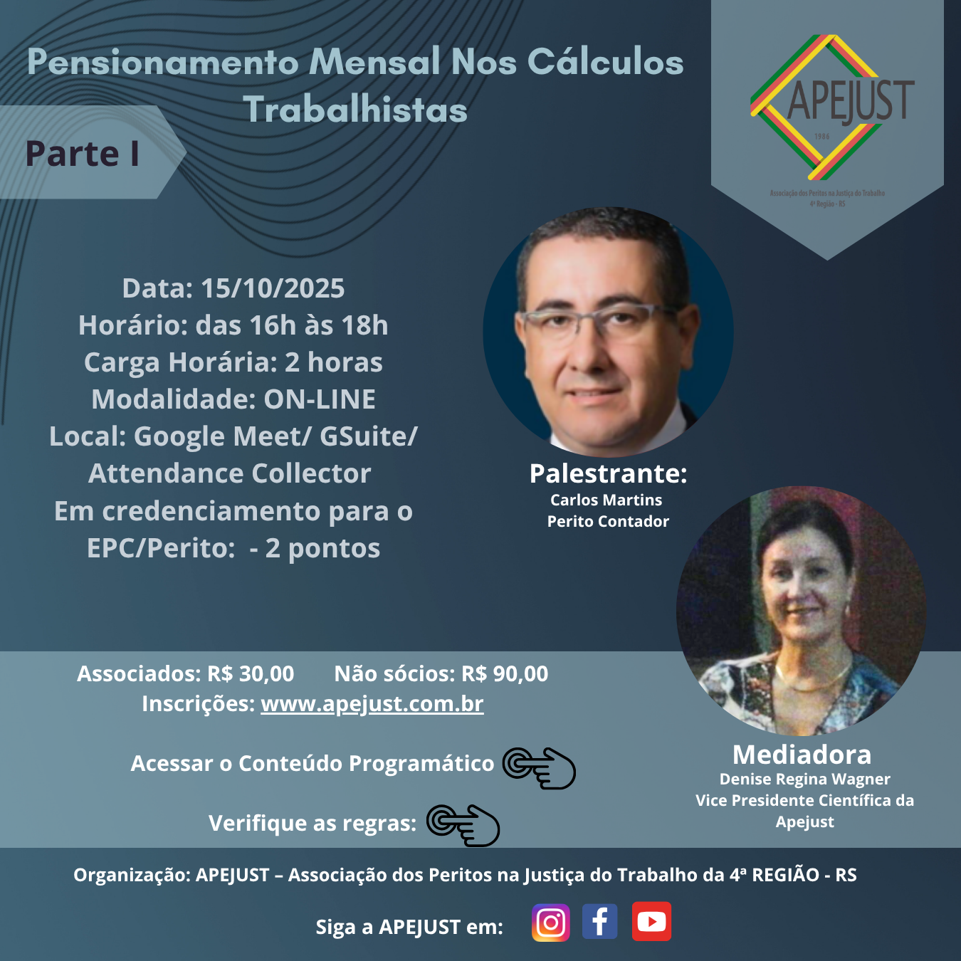 – Objetivo: formatado em linguagem jurídica, porém simples e dinâmica, a palestra busca demonstrar os fundamentos e cálculos trabalhistas de pensões por acidente de trabalho e a sua implantação no Sistema Pje-Calc, de acordo com a legislação trabalhista, recorrendo as Súmulas e Orientações Jurisprudenciais do TST e do TRT da 4ª Região.