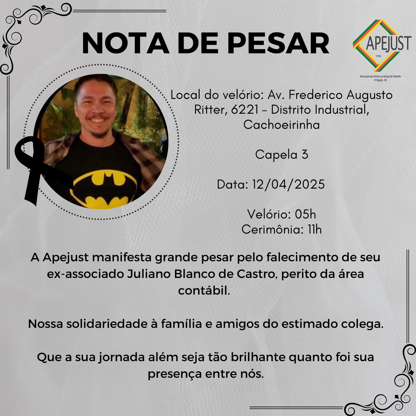 A Apejust manifesta grande pesar pelo falecimento de seu ex-associado Juliano Blanco de Castro, perito da área contábil.